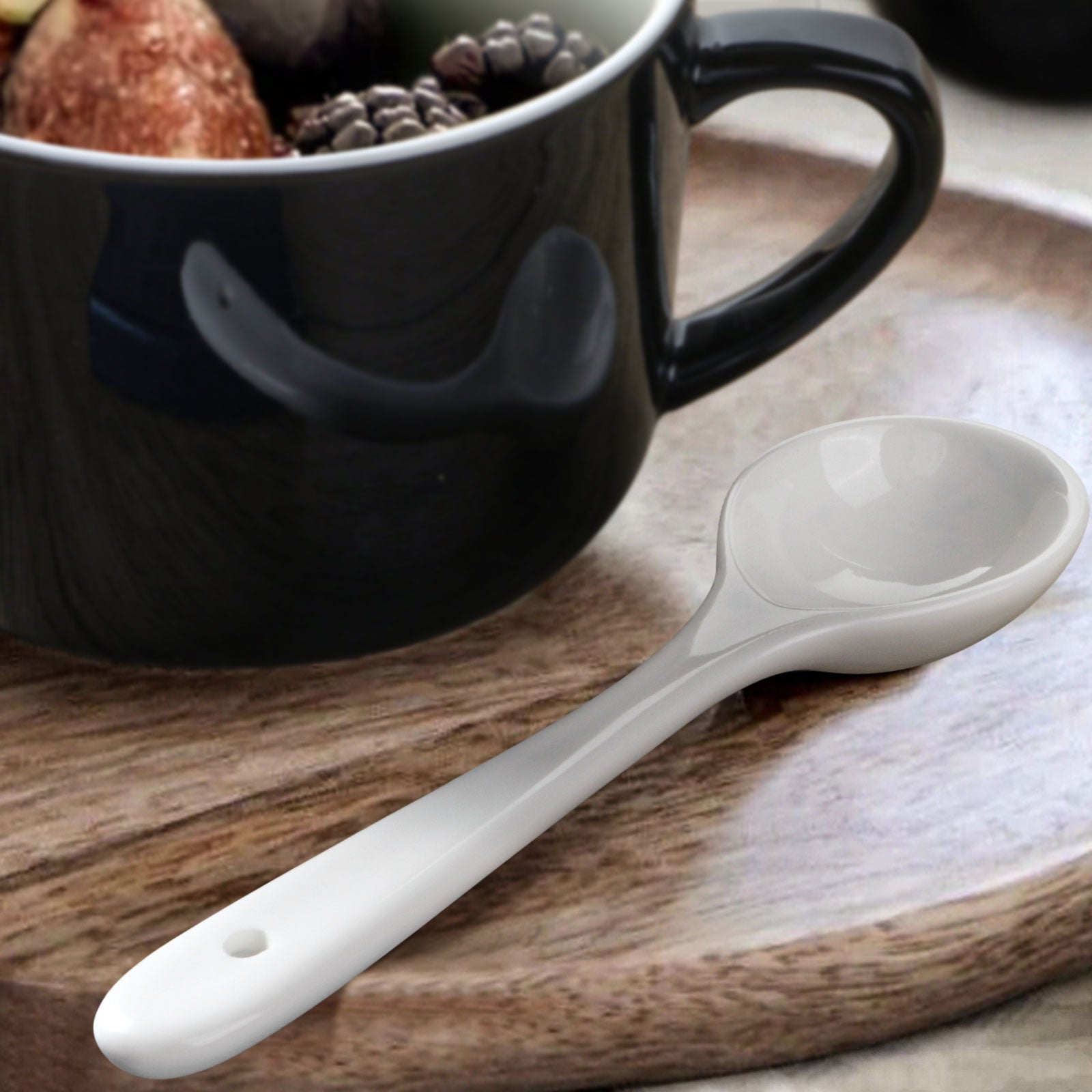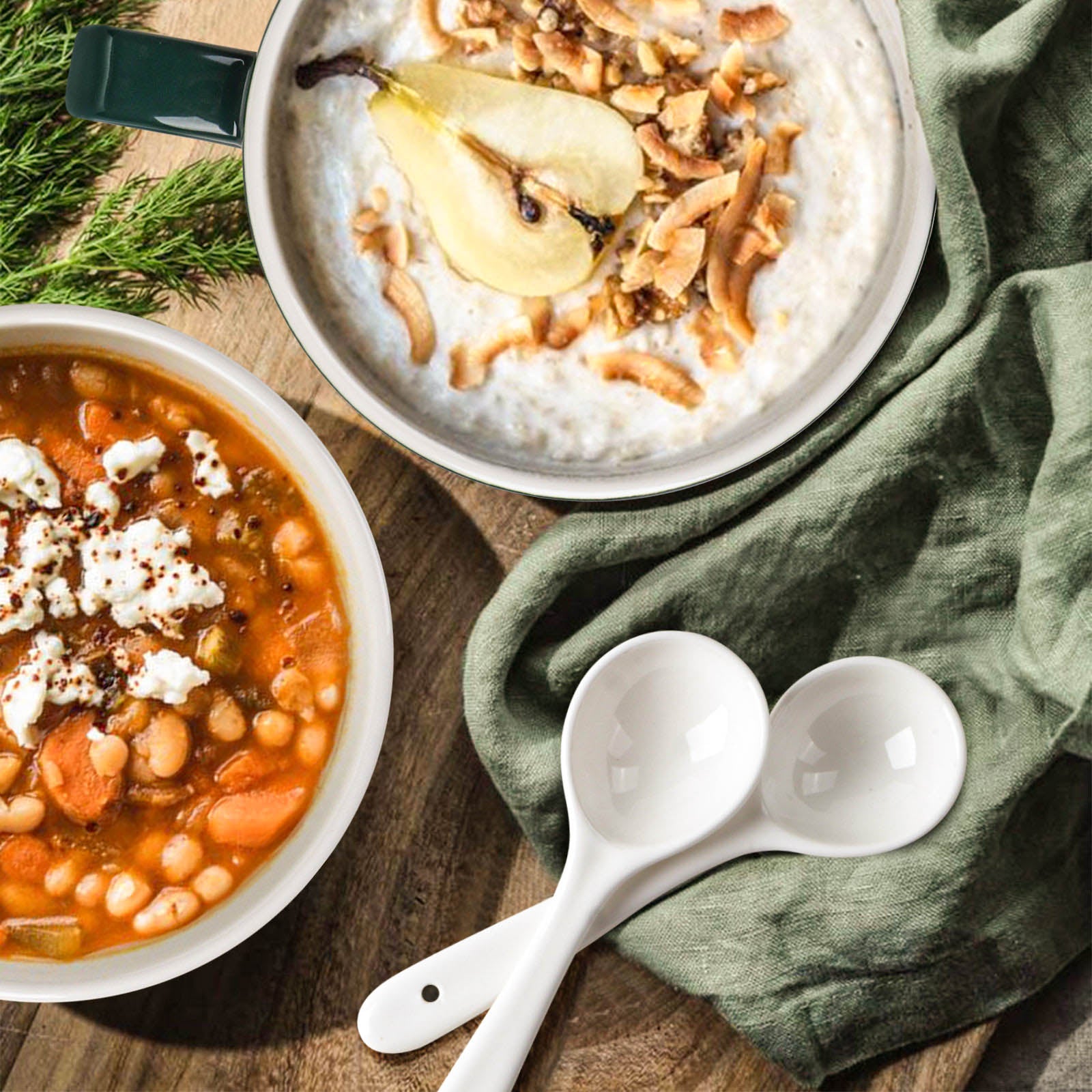 -  【SOUP BOWLS WITH SPOONS】The soup spoon is big and sturdy enough to hold all different types of wonton, pho, udon. No worry about getting worn, rough, bent, rust, bad smell, or distorted when in the heat. The handle of the ceramic spoon is very wide and thick, it is very comfortable in your hand.
